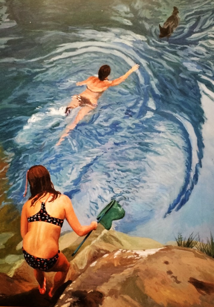 Los cuadros de personas bañándose en las pozas del Prepirineo, que pintó entre los años 2014-2022, quizás sea la serie más abundante que se puede ver en esta exposición; nada menos que dieciséis obras. Inevitablemente, la mayoría de estos óleos nos recuerdan al modo en que Sorolla representaba su pasión por el agua y la carne, – no debemos olvidar que Mayayo conoce perfectamente la historia del arte, como veremos más adelante-. En realidad, poco tienen que ver los bañistas de uno y otro autor, a excepción de ese aire impresionista que conservan ambos pintores, y que alude a la pintura a plein air. Los personajes y animales que aparecen en los cuadros de Mayayo nadan, se mueven o retozan sobre el agua; son, en definitiva, escenas de disfrute y de fusión con la naturaleza.