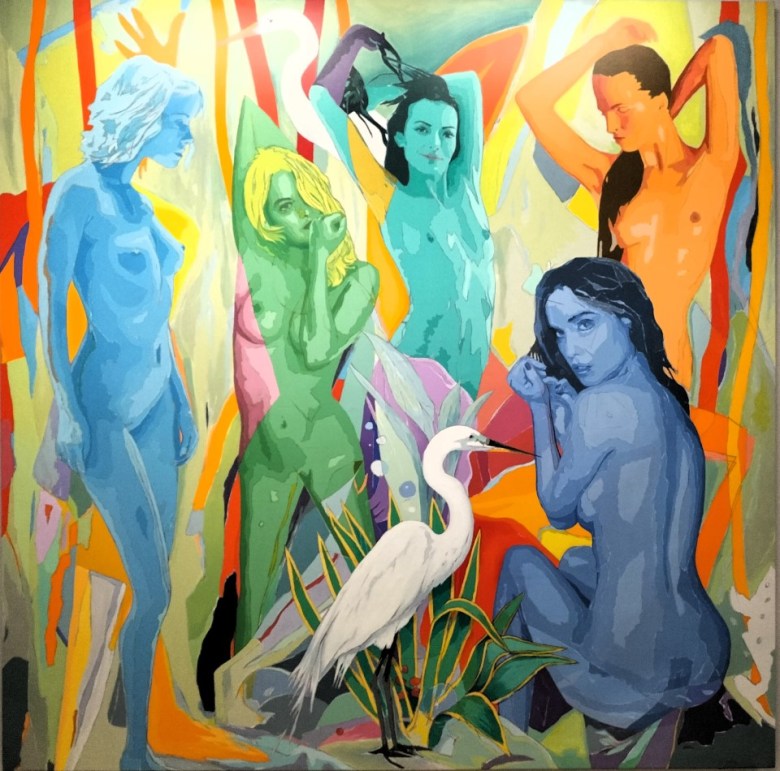 El artista ha incluido algunas pinturas que ya figuraron en la última exposición que pudo verse en Zaragoza en el 2919 en las salas Goya y Saura del Paraninfo de la Universidad de Zaragoza. Paco Simón retomó aquí el tema de la mujer recreando, desde una visión contemporánea, a las odaliscas del pintor Jean-Auguste Dominique Ingres. Son mujeres poderosas, libres y desafiantes. En sus desnudos encontramos cuerpos rotundos y sensuales: Un baño en el bosque de Henri (2019), o Red & Blue (2018) son buenos ejemplos. En cambio, en la obra Las garzas (2019), el cuadro recuerda bastante a Las señoritas de Aviñón (1907)de Picasso con algunas diferencias. En la obra de Simón han desaparecido las referencias a las máscaras africanas que tanto interesaron al artista malagueño o a la cultura ibérica; en cambio, sí encontramos en las modelos que posan en el cuadro referencias contemporáneas, no en vano, en estos cuadros el artista quiso retomar la temática y el concepto de sus pinturas de los años 80 para volver a ser reinterpretadas con la experiencia adquirida con el tiempo, también encontramos en este cuadro un erotismo sutilmente relacionado con las chicas pin-up.