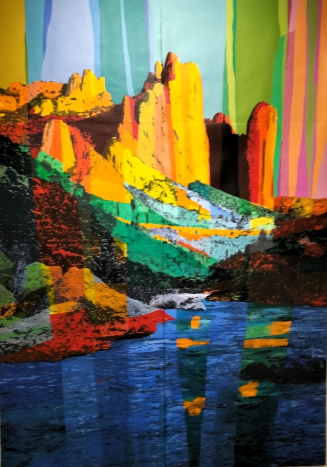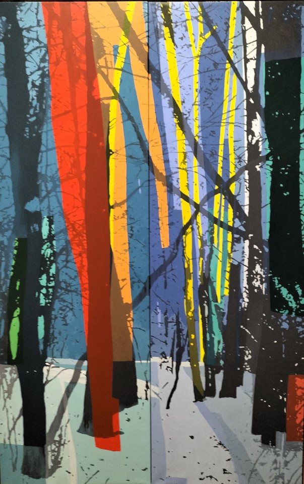 La última parte de esta exposición es la que verdaderamente da título a la muestra en La Lonja. Afirma el propio artista en el catálogo: «en el año 2021 fui invitado a participar como artista residente en el Leitrim Sculpture Center de Manorhamilton, Irlanda. Allí tenía que desarrollar un proyecto específico para el lugar como parte del trabajo que culminaría con una exposición. La posibilidad de empezar a elucubrar sobre qué hacer para este nuevo proyecto, era para mí, como siempre, una gran oportunidad de volver a replantearme mi trabajo anterior y darle de nuevo una vuelta. Pensé que sería un buen momento para abordar el tema del paisaje de una manera directa». Gran parte de la pintura paisajista que muestra Simón está relacionada con el movimiento Land Art. Estas pinturas de Paco Simón no muestran a la naturaleza domesticada, pese a que se alejen del paisajismo tradicional al cubrir con manchas de colores ajenos al cromatismo original, formando una especie de fauvismo renovado. Esto se aprecia muy bien en la obra titulada Riglos (2023), uno de los cuadros más grandes de la exposición. Aquí, los mallos, el paisaje y el agua, son coloreados con un cromatismo natural que se lograría mirando este paisaje a través de los colores que nos proporcionaría una vidriera. En el cuadro titulado Mediterráneo (2022), encontramos colores brillantes que aparecen constantemente en el paisaje, lo mismo sucede en la obra Bosque blanco (2024). Todos los cuadros de esta última etapa tienen su origen en la fotografía. Se trata pues de representaciones fidedignas de la naturaleza y al mismo tiempo contienen una iluminación irreal, lo que conlleva en el espectador una duplicidad en la mirada. Paco Simón finaliza esta muestra con una instalación titulada Bosque. Son troncos recubiertos por un paisaje sonoro, tras los cuales se esconden algunas figuras pintadas por el artista.