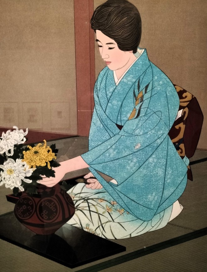 Ito Shinsui. Kasumi Teshigawara arreglando crisantemos. Ca. 1960. Xilografía sobre papel. Foto. José Antonio Val