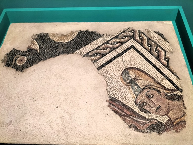Las escenas mitológicas, a la par que religiosas, eran motivos habituales en los encargos muralistas y musivarios, artistas itinerantes, que durante siglos ornamentaron las casas de mayor riqueza de la Colonia como la domus de las murallas o la domus de la calle Añón entre otras. En esta exposición, figuran el Mosaico de El juicio de París, confeccionado con teselas de piedra y vidrio policromo presenta con gran definición parte de una escena en la que aparece un varón tocado con gorro frigio y feroz quimera en el frontal. La figura se encontraría en la esquina superior derecha del emblema o escena, muy escorada junto a la orla sogueada que lo enmarcaría. La otra escena que podemos apreciar, es una pintura al fresco, que forma parte del mural de las musas. Se trata de una figura femenina retratada hasta el busto y de mirada de frente sobre fondo blanco. Presenta el pelo negro, largo llegándole hasta los hombros y va tocada con una diadema de plumas. La vestimenta, una túnica blanca, y el resto de atributos ha hecho identificarla con la musa Clío, musa de la Historia. Considerando esta identificación sería probable que el resto de paredes del lujoso triclino, en el entorno de la actual calle de San Agustín, estuviera presidido por una imponente galería pictórica con las nueve musas clásicas: Calíope, Clío, Euterpe, Talía, Melpómene, Terpsícore, Erató, Plomnia y Urana