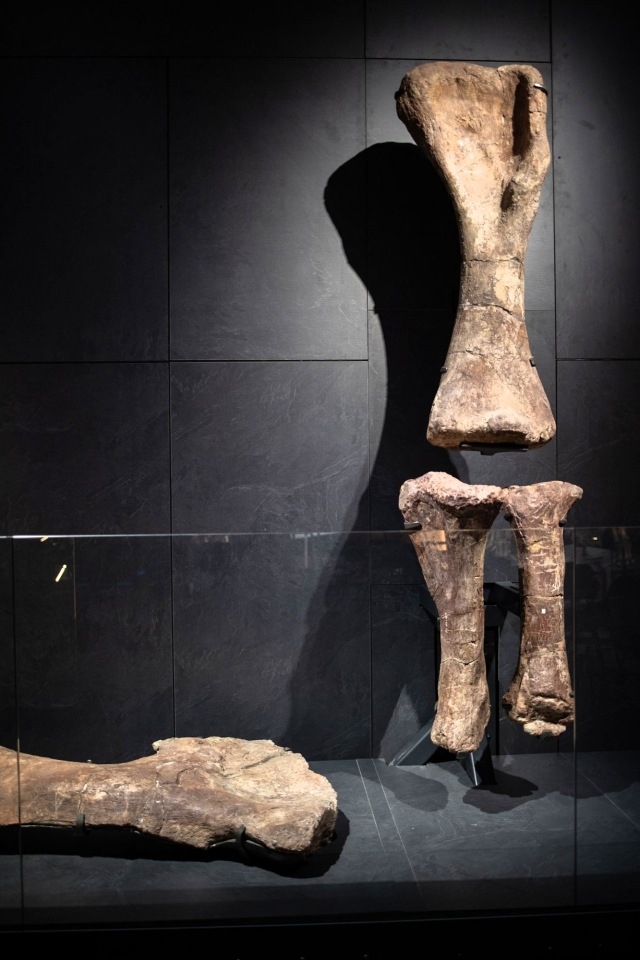 La exhibición combina los impresionantes modelos con fósiles reales. Entre otros, se muestran dos fémures, un húmero, un cúbito y un radio de Patagotitan. La medida de la circunferencia de su húmero y de su fémur, así como una reconstrucción tridimensional realizada escaneando todos los huesos, permitieron estimar su tamaño. Sus 38 metros de largo lo convierten en el animal más grande que haya poblado la Tierra. Estos son holotipos, es decir, ejemplares originales a partir de los que se describió a esta especie de dinosaurio. Los visitantes también podrán conocer a través de audiovisuales el entorno donde se encontraron los restos del Patagotitan y cómo fue su excavación, que se alargó durante tres años y requirió de otros dos de trabajo de laboratorio que implicó a un equipo de más de 100 profesionales de diferentes disciplinas.